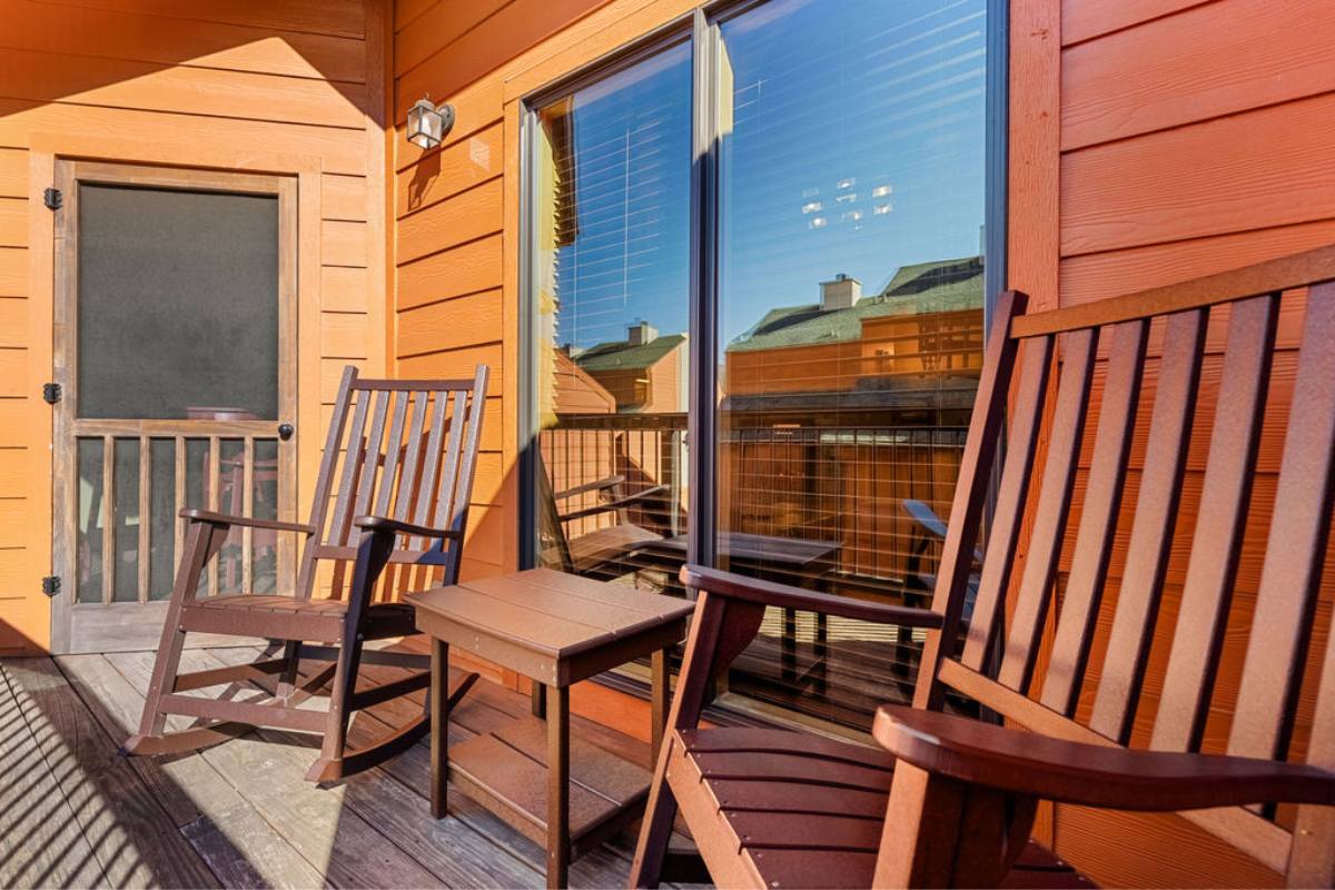 Step outside to your private balcony, with rocking chairs, and enjoy the tranquil resort views, perfect for sipping your morning coffee or unwinding after a day of adventure. The balcony offers a great view of the outdoor pool.