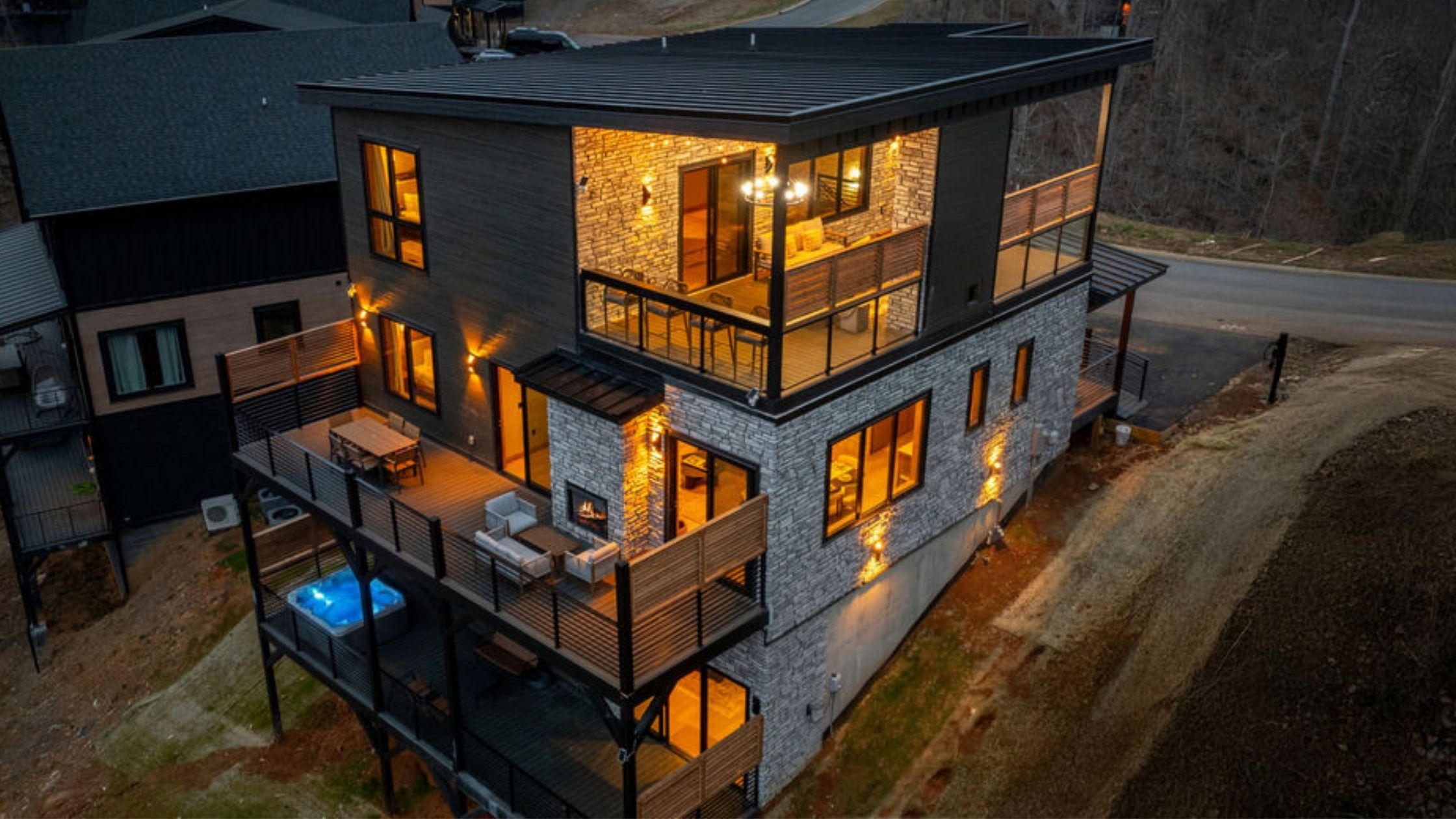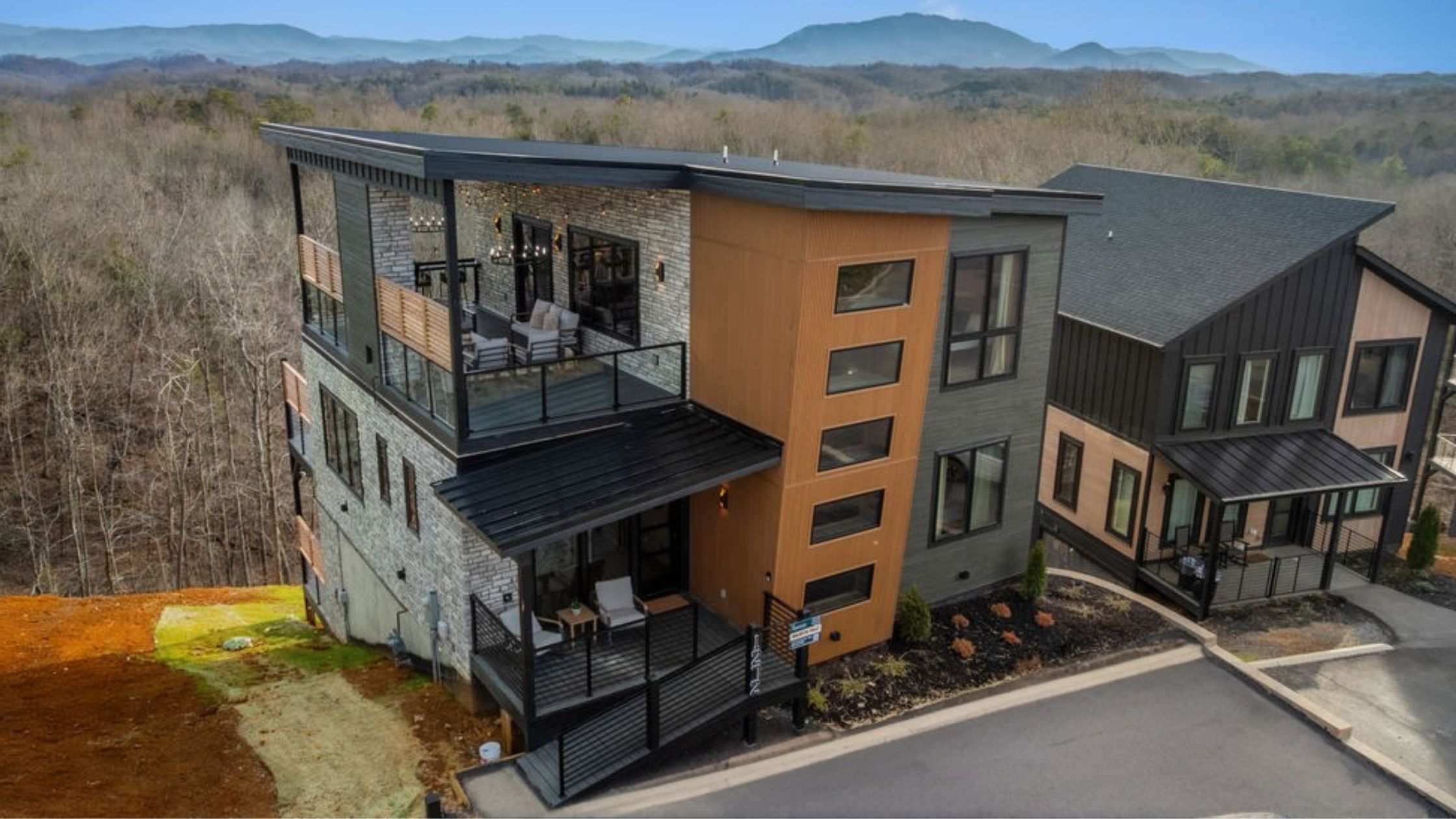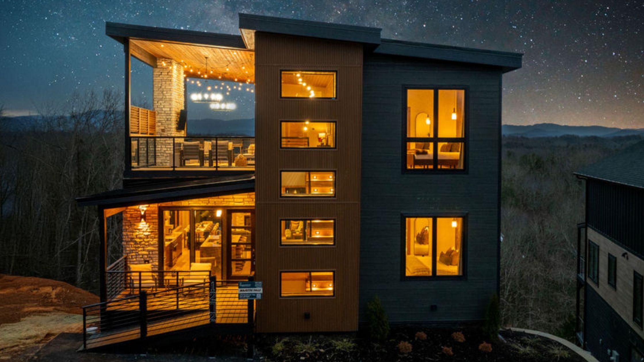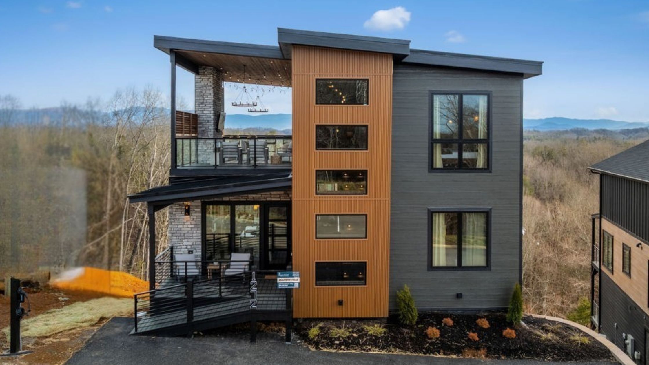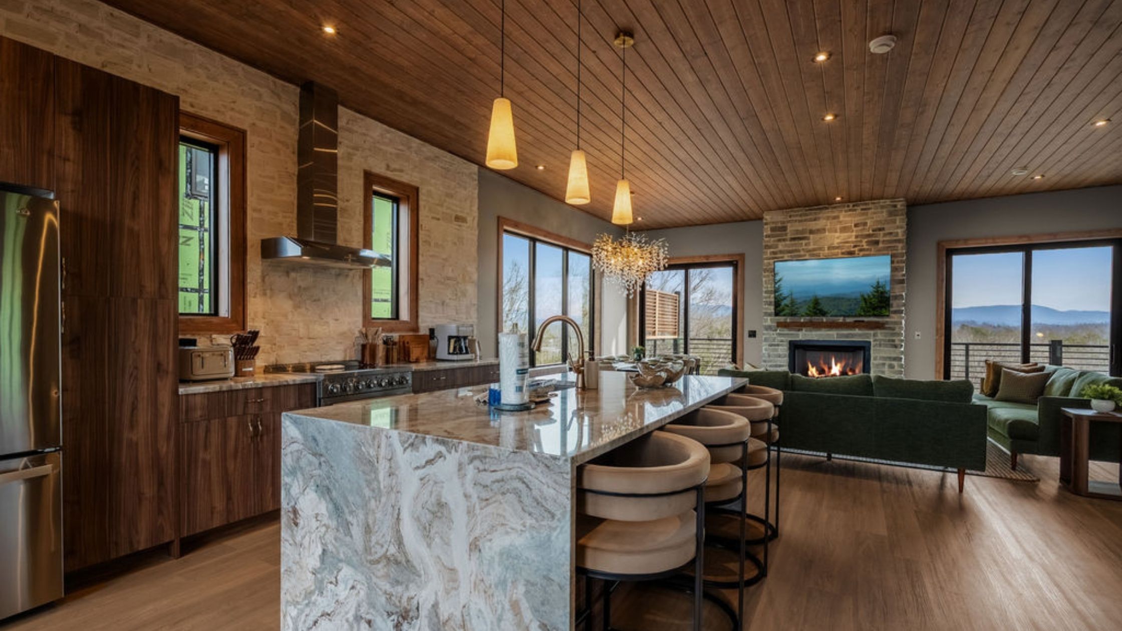 This beautifully designed 4-bedroom, 5 1/2-bathroom mountain cabin offers high-end finishes, spacious interiors, and panoramic views from every level.