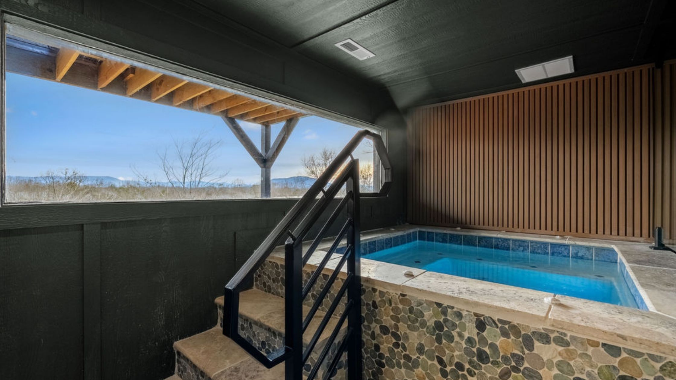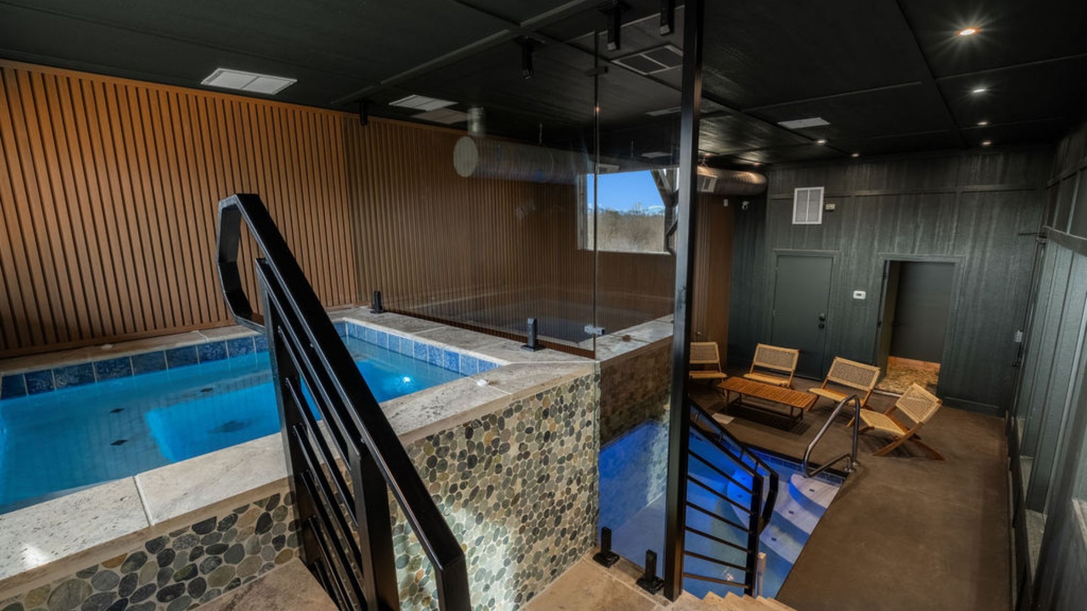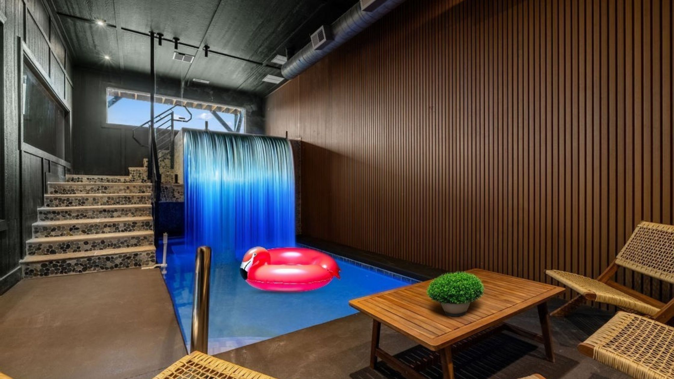Private indoor pool room with grotto + waterfall