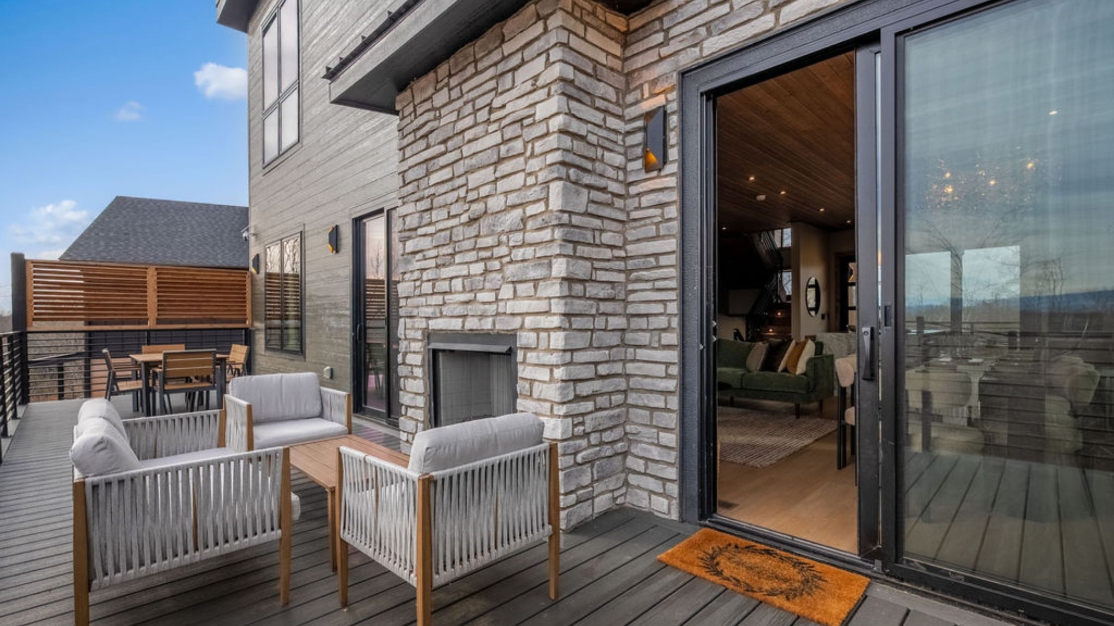 Access to main deck with outdoor fireplace & lounge seating