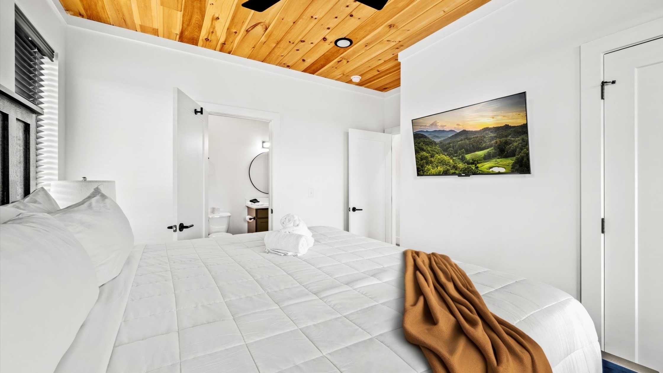 - Bedroom 2 (Main Floor): King bed, flat-screen TV, ensuite bathroom.