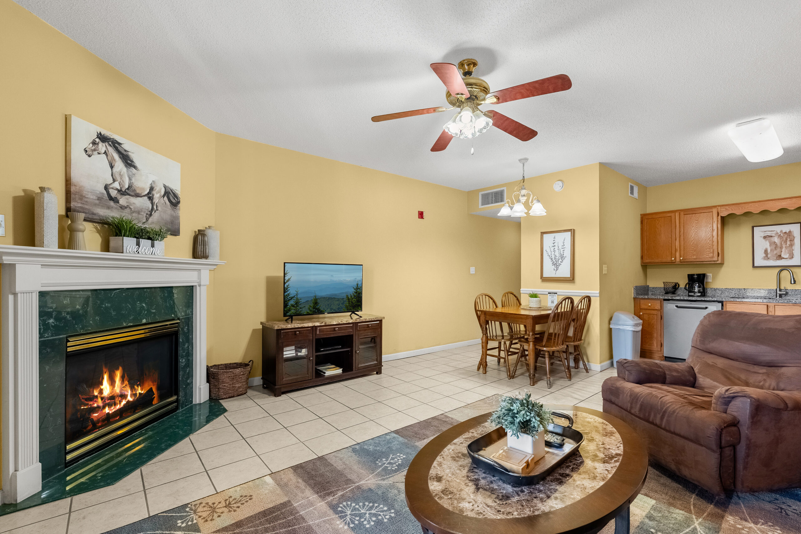 The living area invites you to relax and unwind after a day of adventure with cozy seating and a seasonal gas fireplace that adds a touch of warmth and charm, creating a perfect ambiance for cozy evenings indoors.