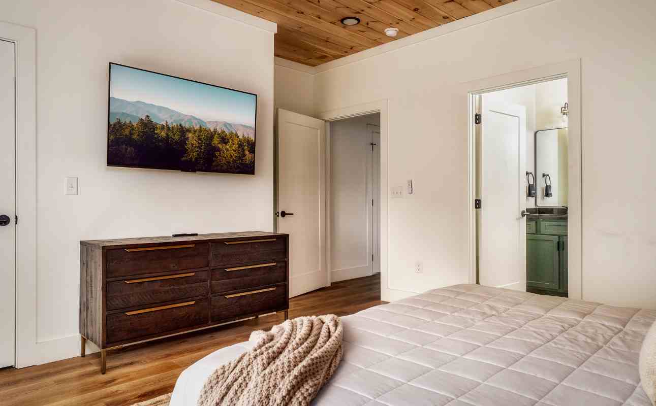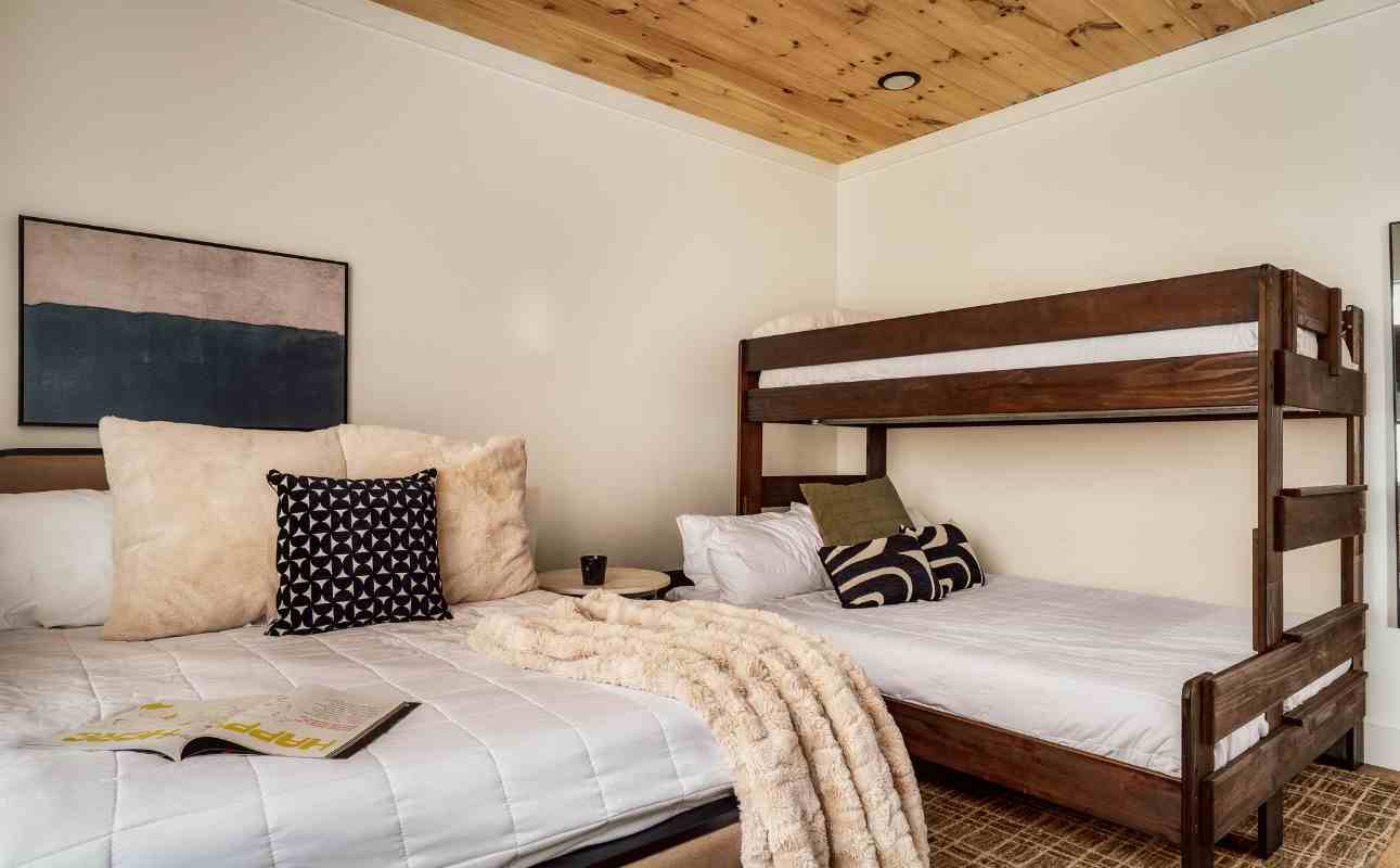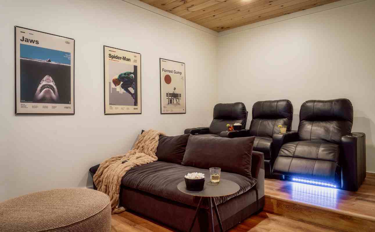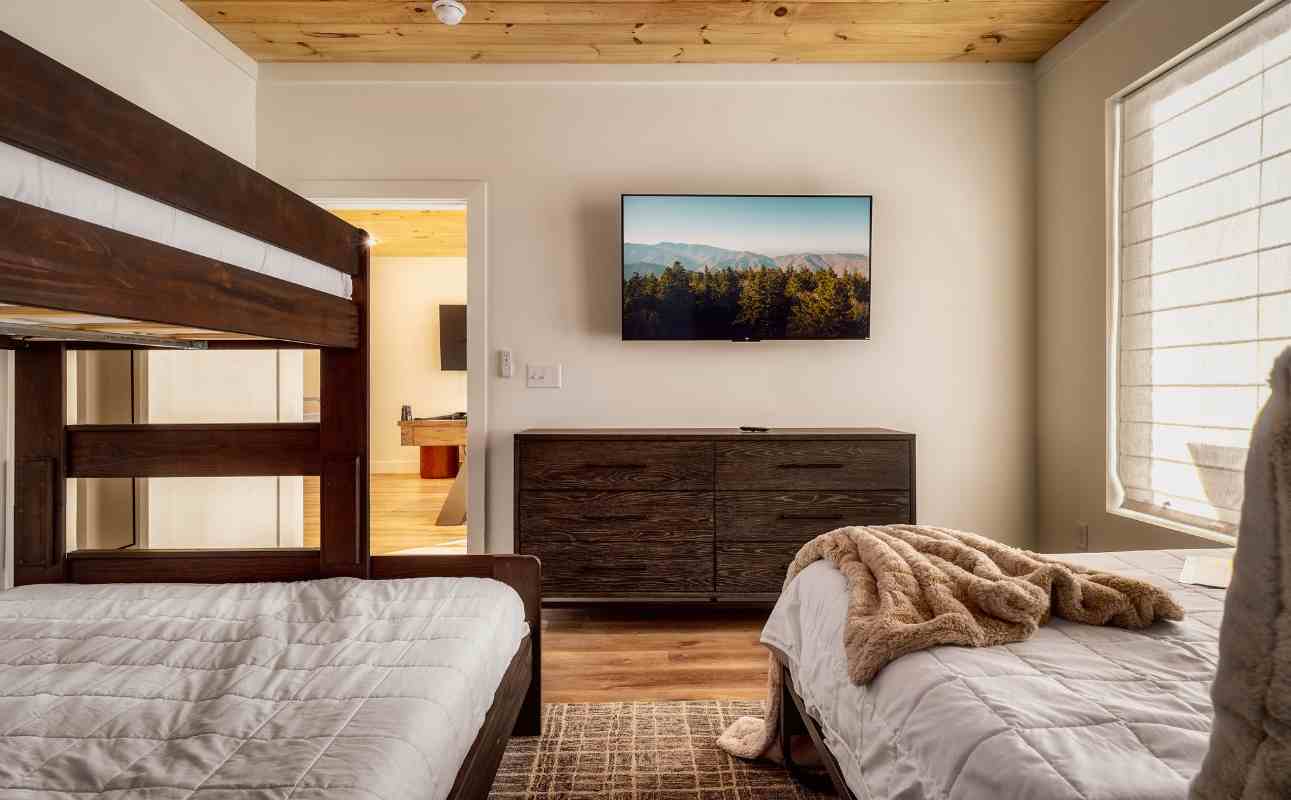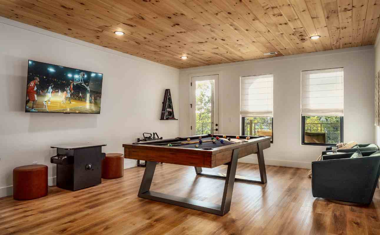 The open-concept modern, mountain vacation rental cabin boasts a fully equipped kitchen, a spacious dining area, and a beautifully appointed living room with large windows to take in the breathtaking mountain views. For entertainment, enjoy the game room complete with a pool table, arcade games, and more. There’s also a cozy theater room with large futon-style sofas that can sleep two, perfect for movie nights.