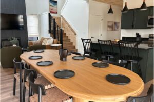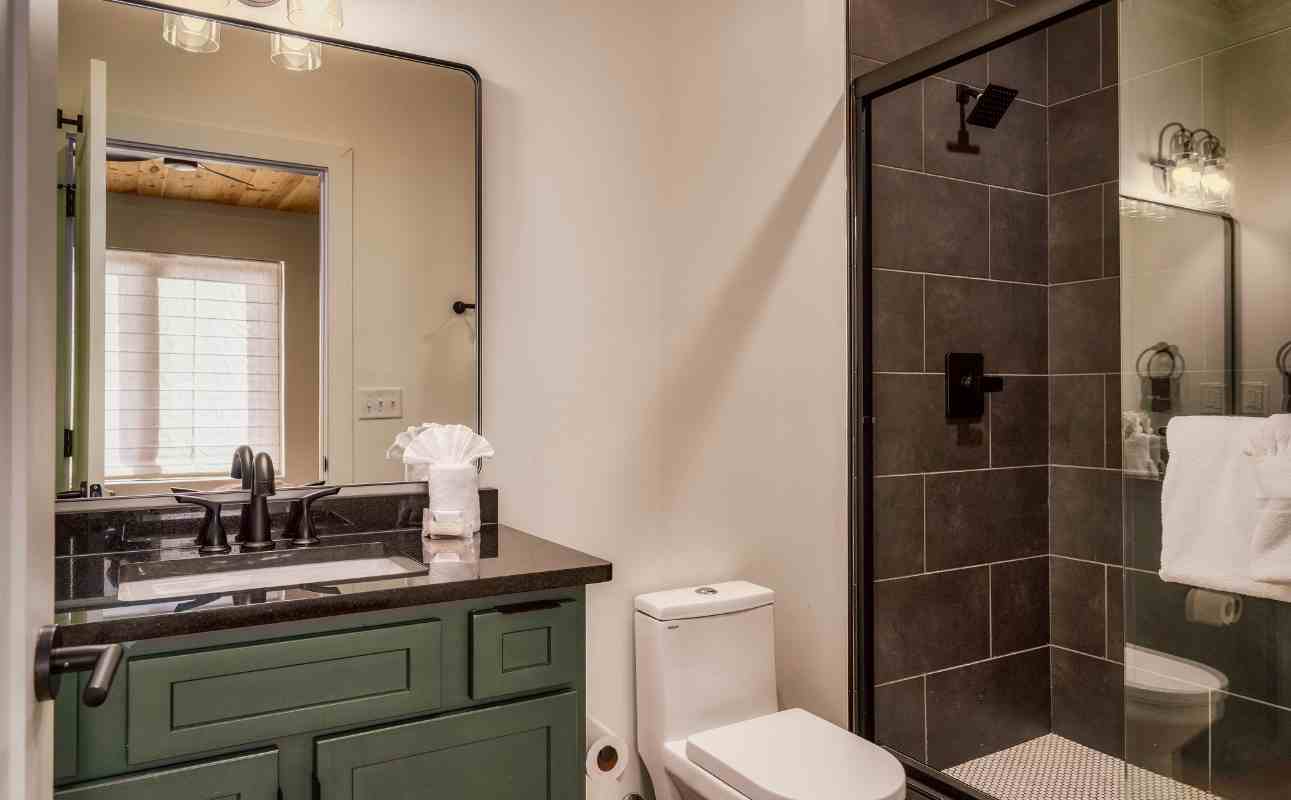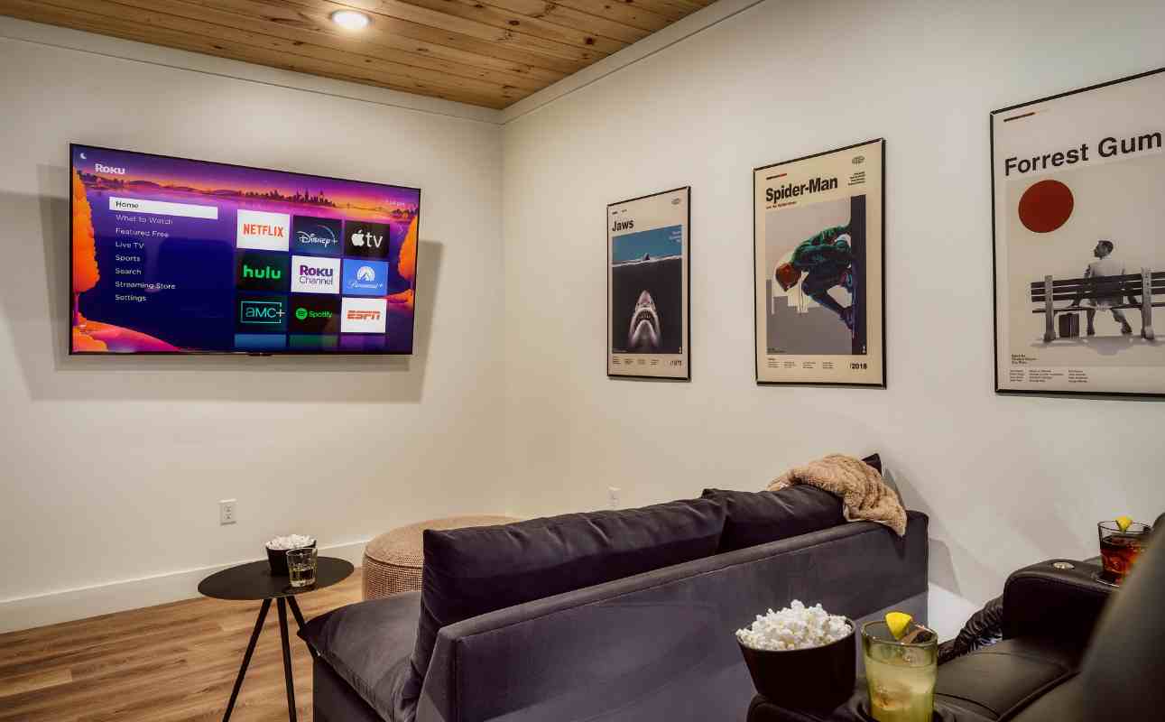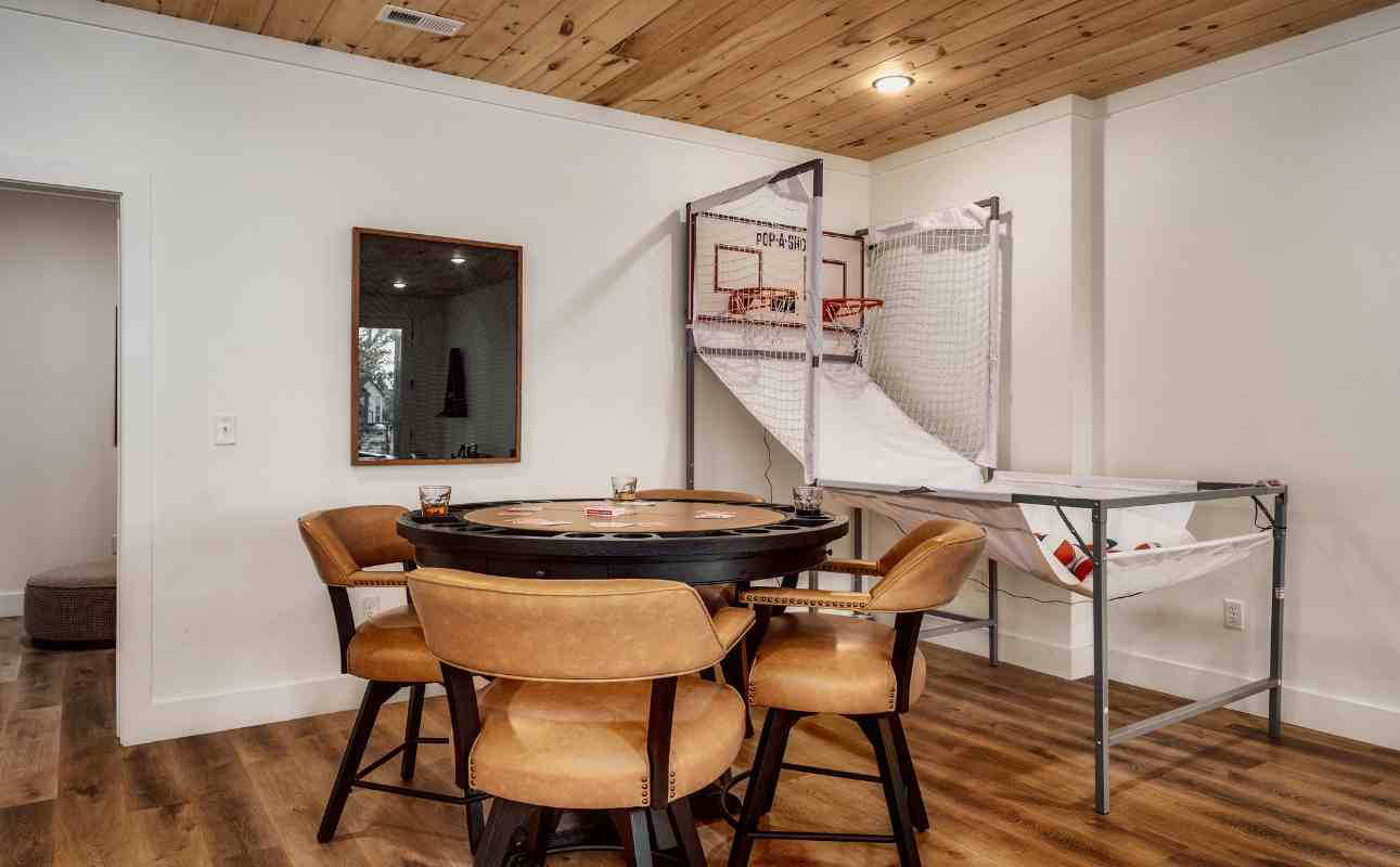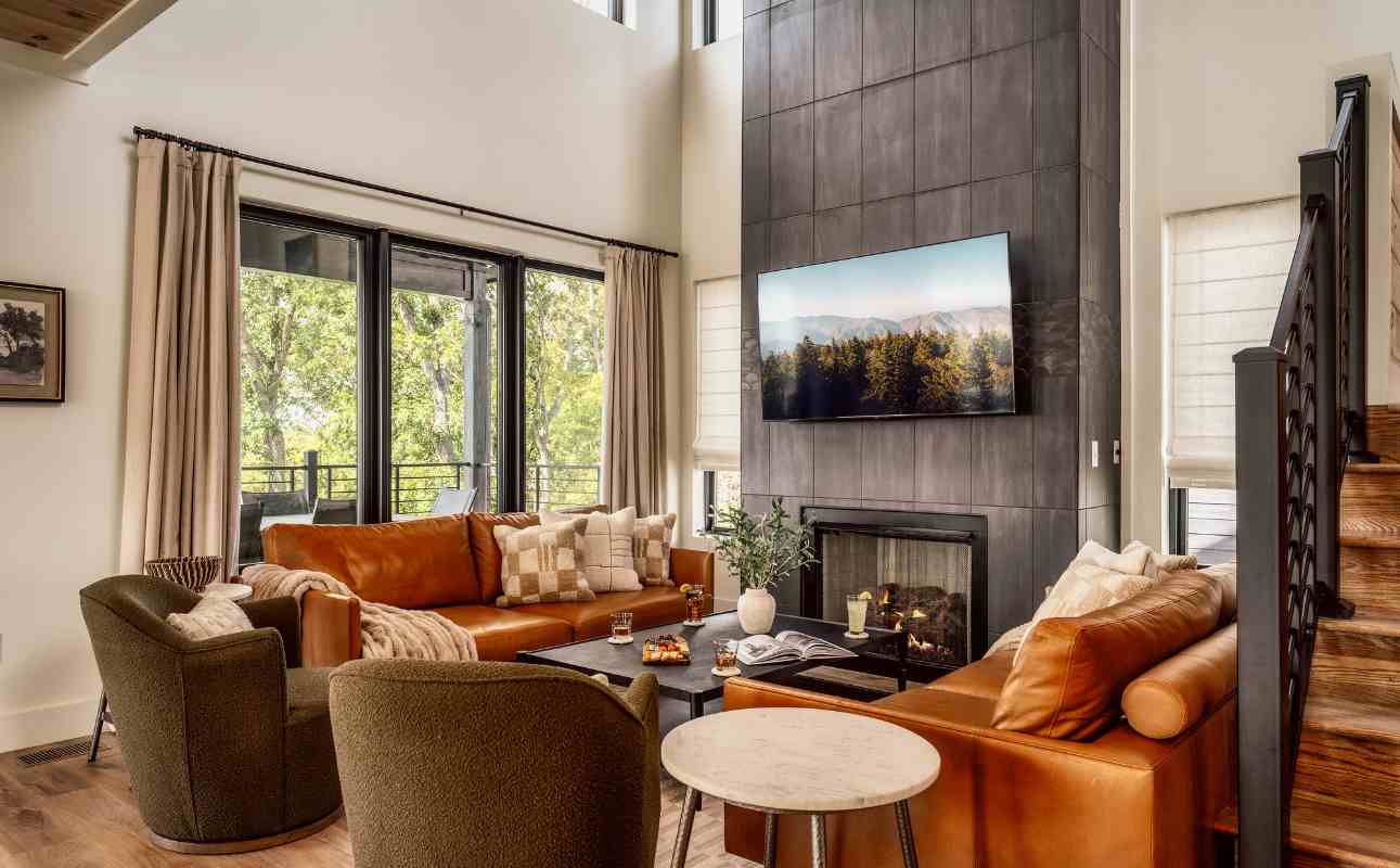 The open-concept modern, mountain vacation rental cabin boasts a fully equipped kitchen, a spacious dining area, and a beautifully appointed living room with large windows to take in the breathtaking mountain views. For entertainment, enjoy the game room complete with a pool table, arcade games, and more. There’s also a cozy theater room with large futon-style sofas that can sleep two, perfect for movie nights.