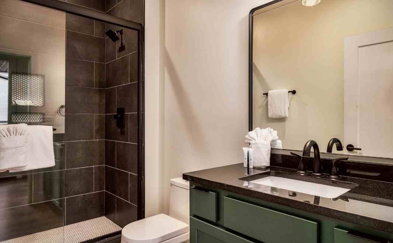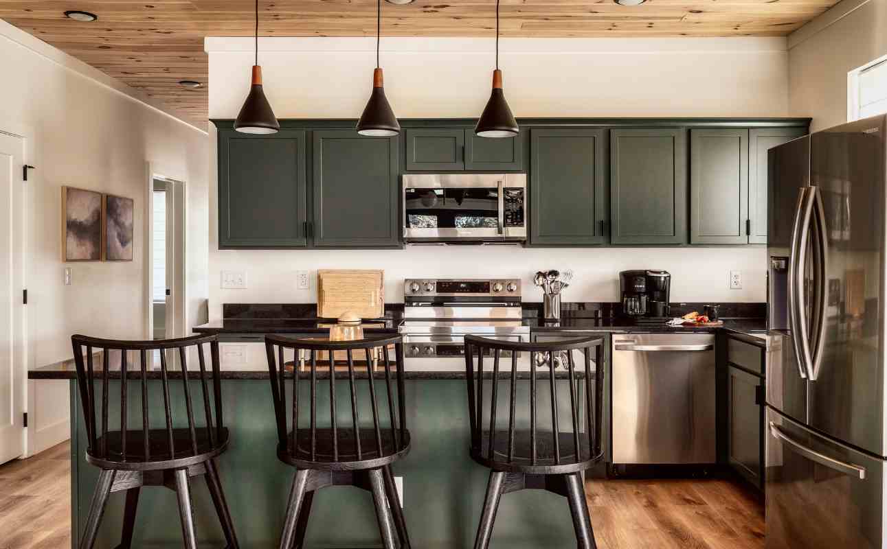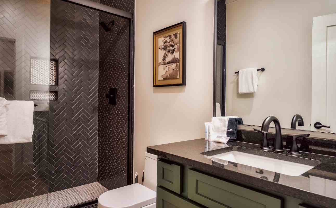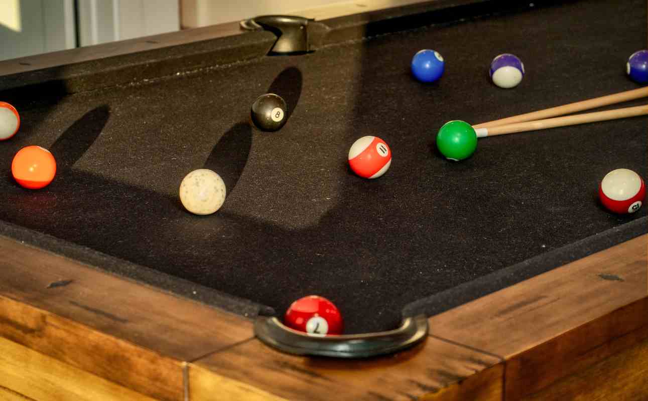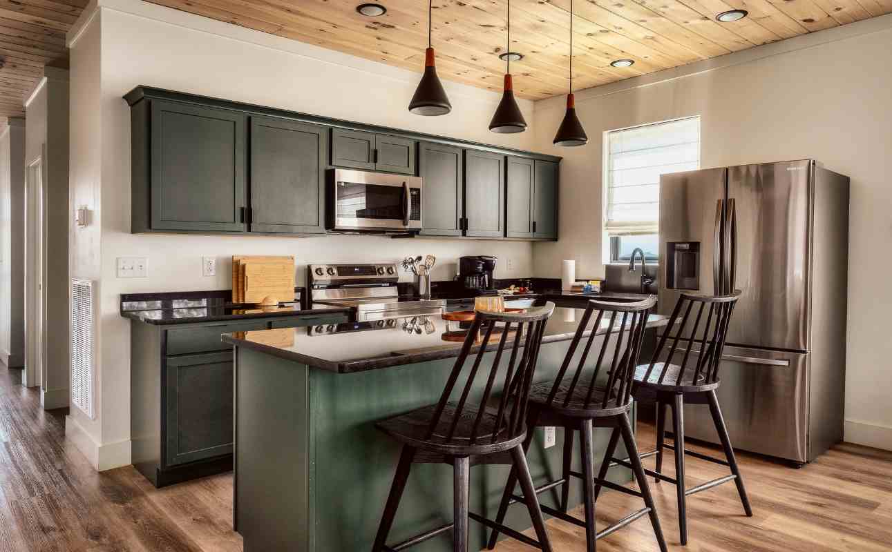The open-concept modern, mountain vacation rental cabin boasts a fully equipped kitchen, a spacious dining area, and a beautifully appointed living room with large windows to take in the breathtaking mountain views. For entertainment, enjoy the game room complete with a pool table, arcade games, and more. There’s also a cozy theater room with large futon-style sofas that can sleep two, perfect for movie nights.