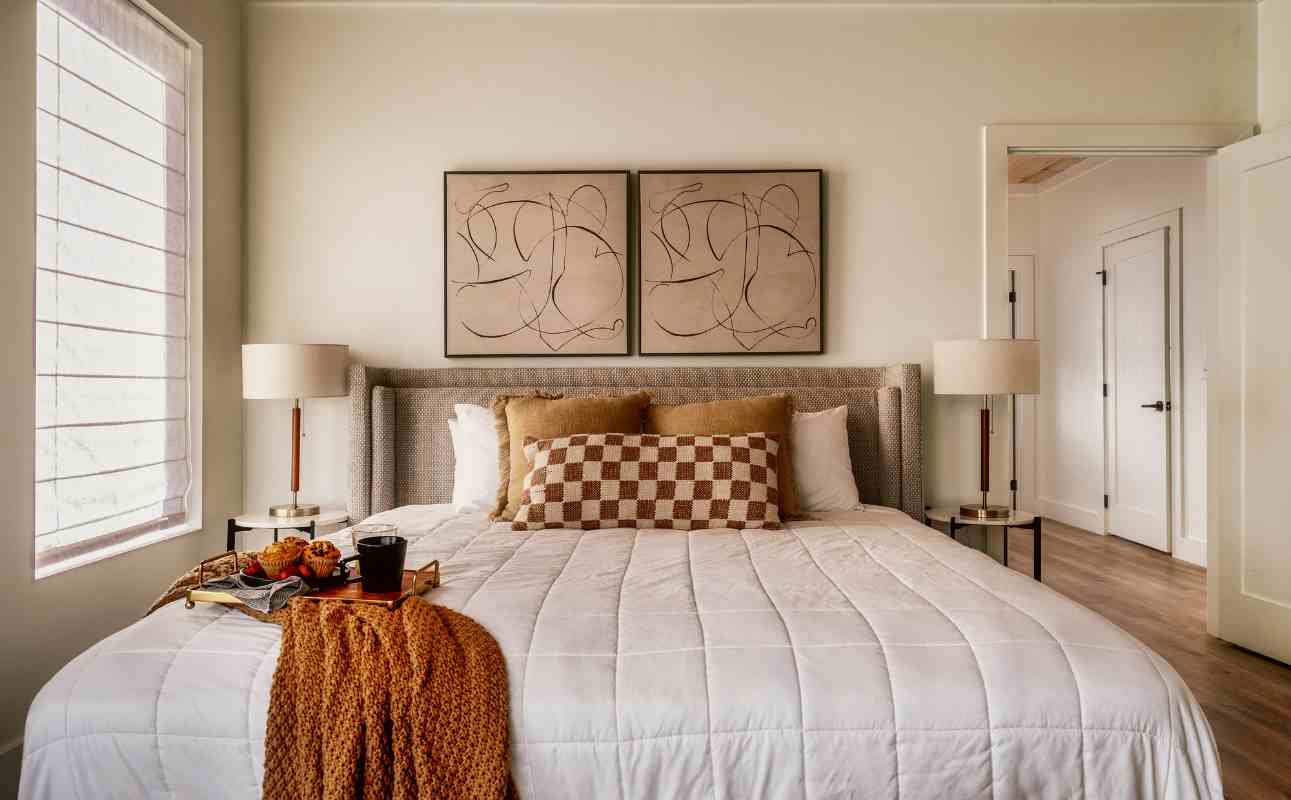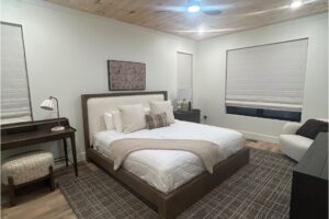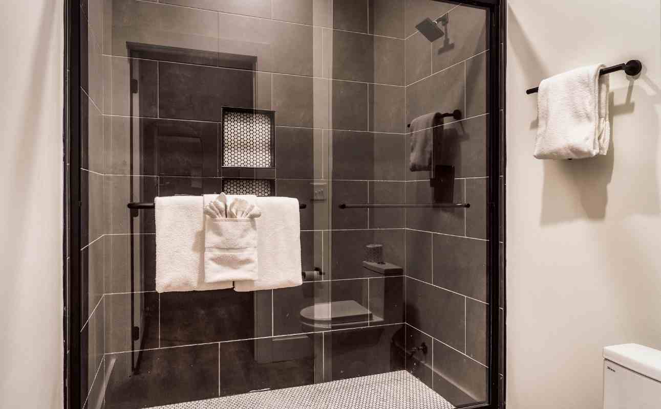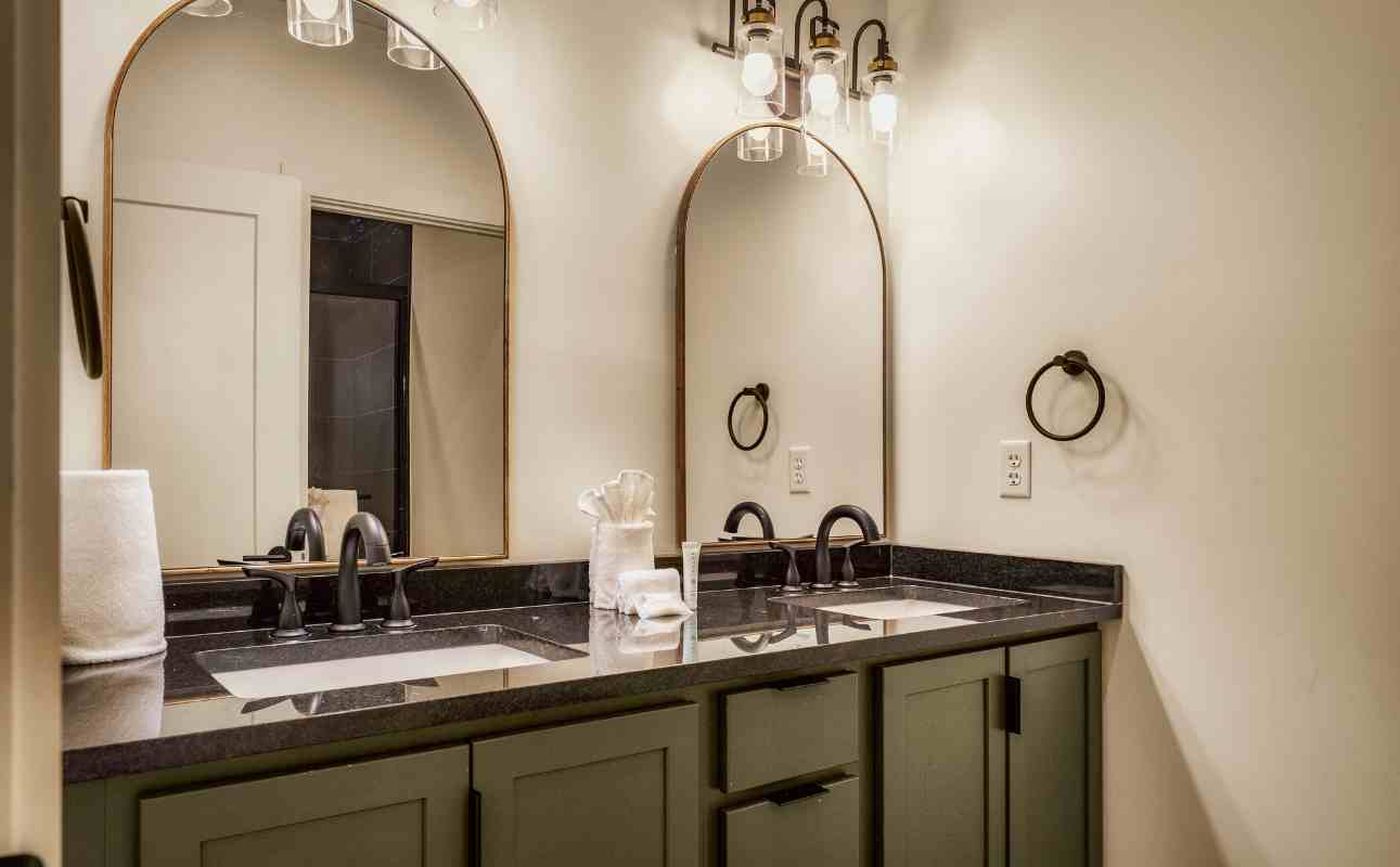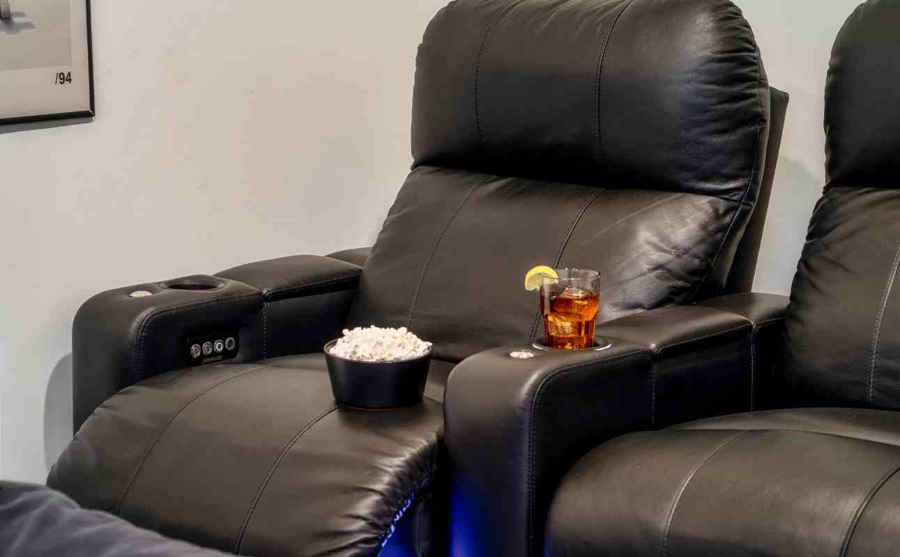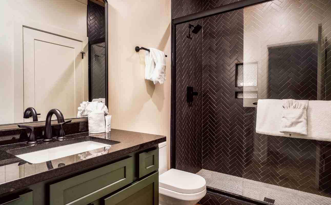 The open-concept modern, mountain vacation rental cabin boasts a fully equipped kitchen, a spacious dining area, and a beautifully appointed living room with large windows to take in the breathtaking mountain views. For entertainment, enjoy the game room complete with a pool table, arcade games, and more. There’s also a cozy theater room with large futon-style sofas that can sleep two, perfect for movie nights.